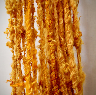 The cloak, with its shaggy golden locks, was woven on my home-built traditional warp-weighted loom. I took great care in dyeing the wool, using local plants from my home on the Rosneath Peninsula, along with onion skins from my kitchen compost bin, to achieve a stunning golden-brown hue.