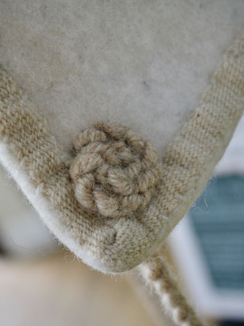 The hat's felted base is made from merino wool mill waste, while the wool thrums and ties are sourced from rachel's own flock of Corriedale/Manx Loaghtan sheep, handspun into chunky yarn and stitched to recreate historic texture. The edge braid is woven on an inkle loom using dead stock yarn from a now-closed borders mill.